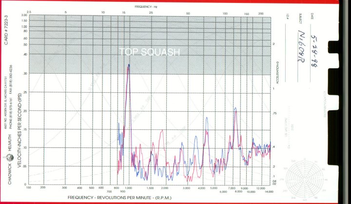 The strobe unit and the velometer are connected to a spectrum analyzer plotter so that the vibrations measured by the velometer can be visualized. The plotter plots velocity in inches/second in the y axis (using log paper) and frequency in the x axis. In other words, you can see how much amplitude the vibrations have at each frequency (you can see harmonics of the frequency that the prop is turning at). (see picture)