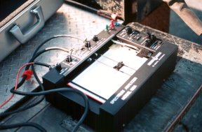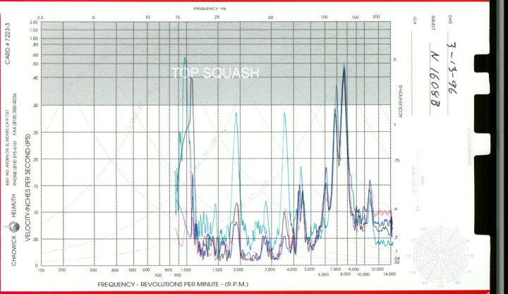 The strobe unit and the velometer are connected to a spectrum analyzer plotter so that the vibrations measured by the velometer can be visualized. The plotter plots velocity in inches/second in the y axis (using log paper) and frequency in the x axis. In other words, you can see how much amplitude the vibrations have at each frequency (you can see harmonics of the frequency that the prop is turning at). (see picture)